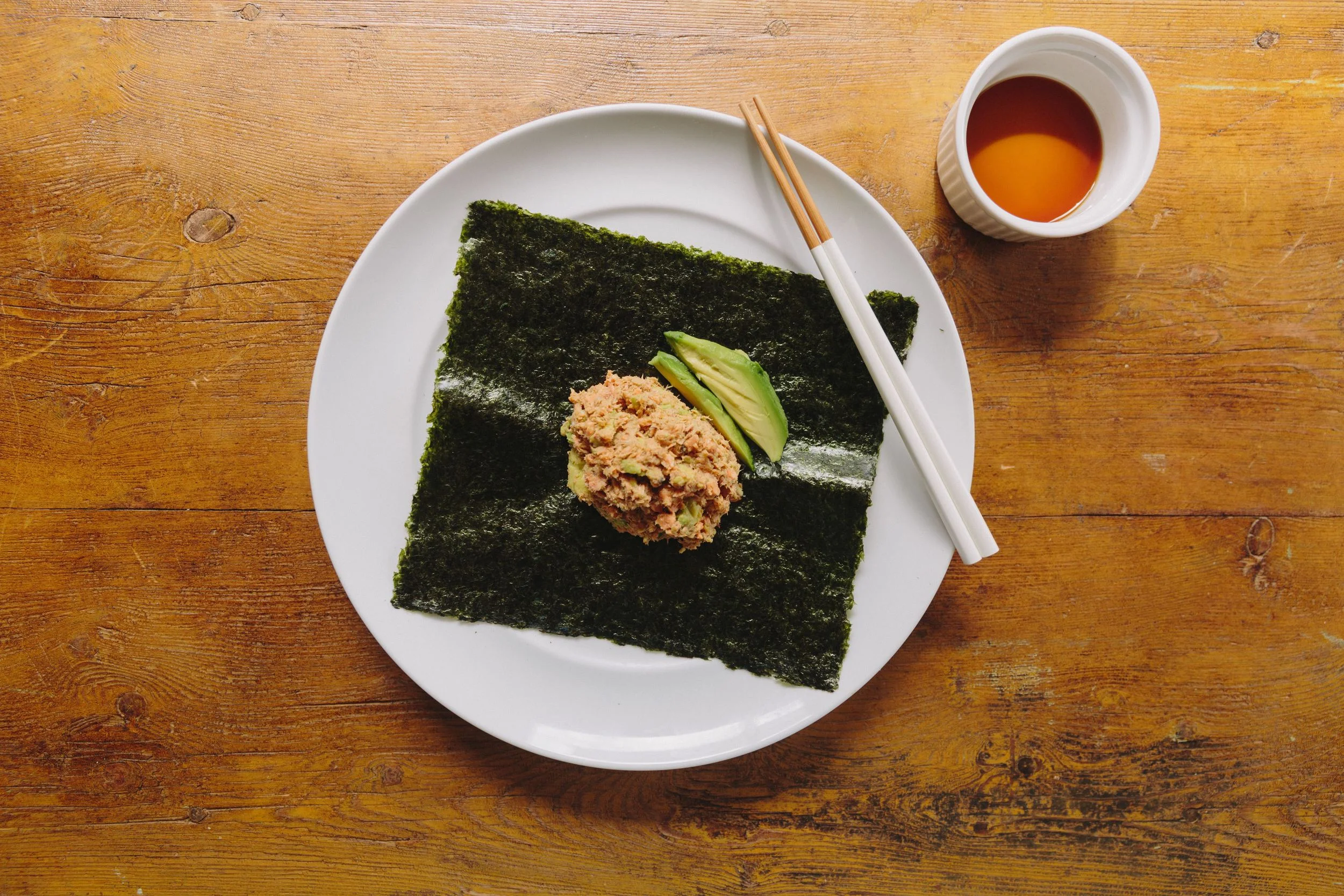 - Place the nori sheets on individual plates and spoon 1/3 of the salmon and avocado on top